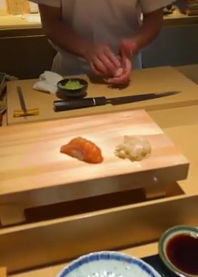 A chef in a white uniform is standing behind a wooden counter, preparing sushi