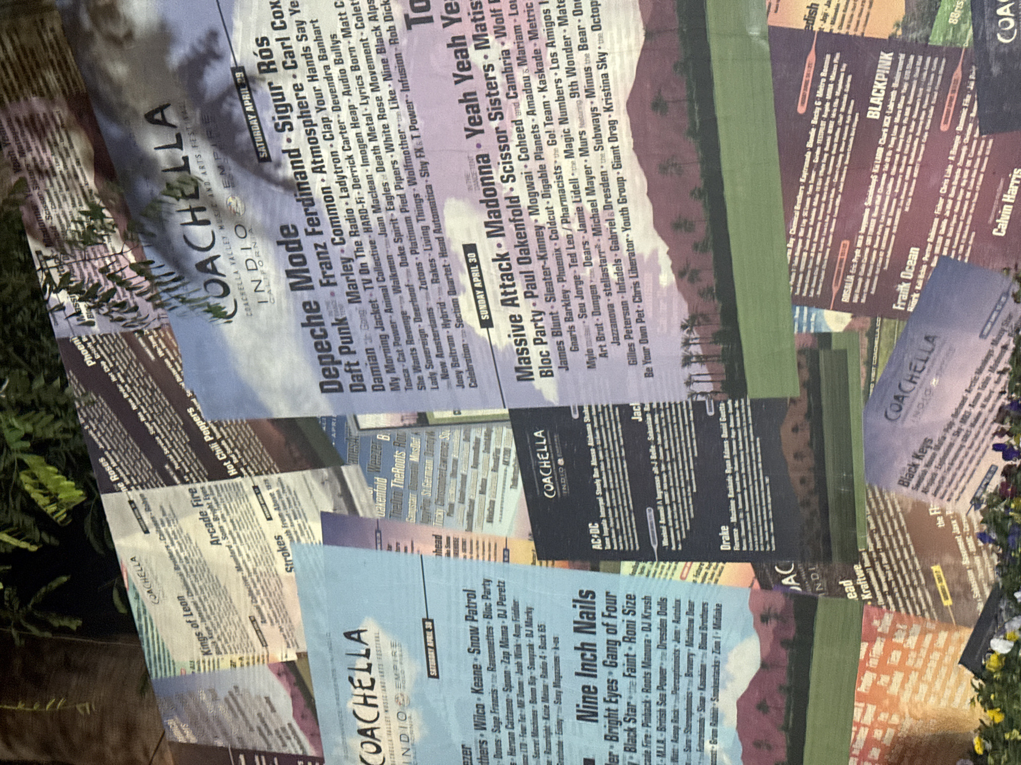 collection of Coachella Valley Music and Arts Festival posters, likely photographed in Indio, California. The posters feature various musical artists and bands. The posters are laid out on a surface with other vegetation. The posters cover Coachella music festival from different years of the music festival.