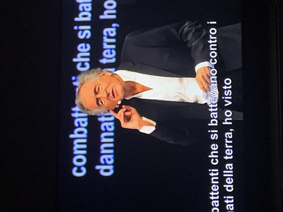 The image displays a middle-aged to elderly man, likely in his 60s or 70s, with wavy grey hair, wearing a dark suit jacket over a white, open-collared shirt. He is centered in the frame, facing forward, with his left hand raised, index finger and thumb touching his left earlobe. A small lavalier microphone is clipped to the right side of his shirt collar. The man stands in front of a large, dark screen that exhibits white sans-serif text in Italian. Visible text segments include "combattenti che si batt" and "dannati terra, ho" in the upper part, and "battenti che si battevano contro i" and "ati della terra, ho visto" in the lower portion. The scene depicts a speaker delivering a presentation or lecture at an event in Strasbourg, France.
