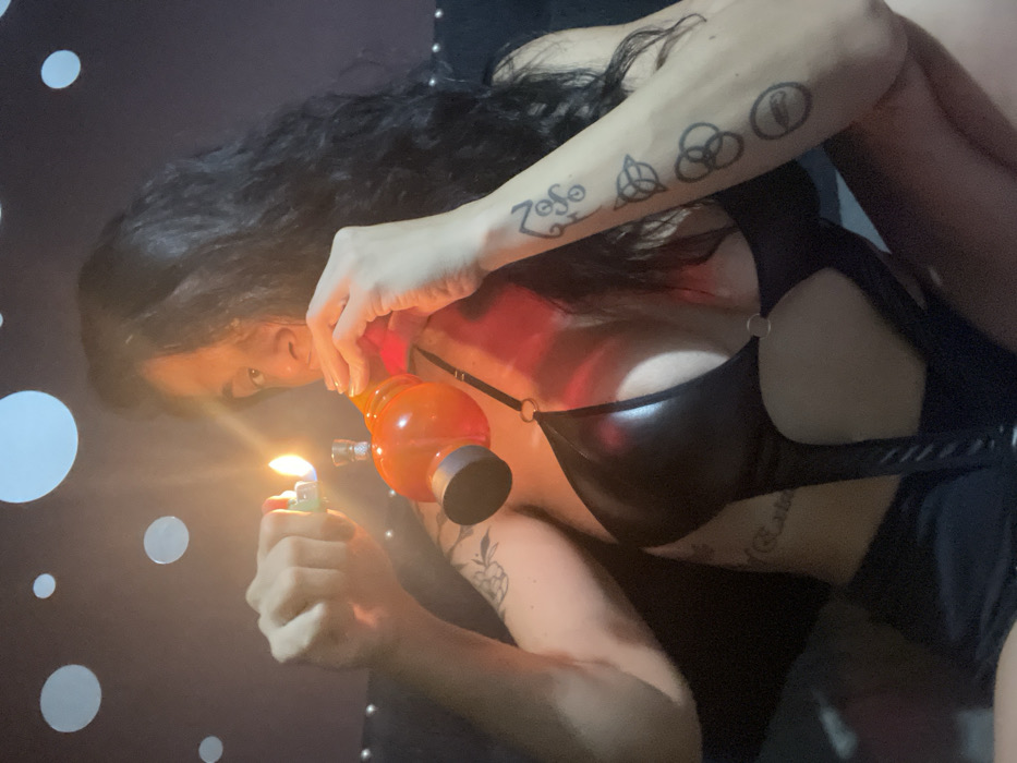 A person with dark curly hair is shown lighting a bong. The individual is wearing a black bra top. Tattoos are visible on both arms. The background is dark with large white circles. The person's face is angled toward the camera as they hold a lighter to the bong.