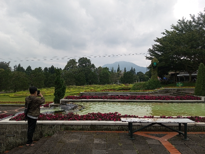 A person in a camouflage jacket takes a picture with a smartphone. A multi-tiered fountain with red flowers lines the edges. A bench sits in the foreground on a stone patio. Green lawns and trees are in the distance, with a mountain faintly visible. The sky is overcast, suggesting a cloudy day.