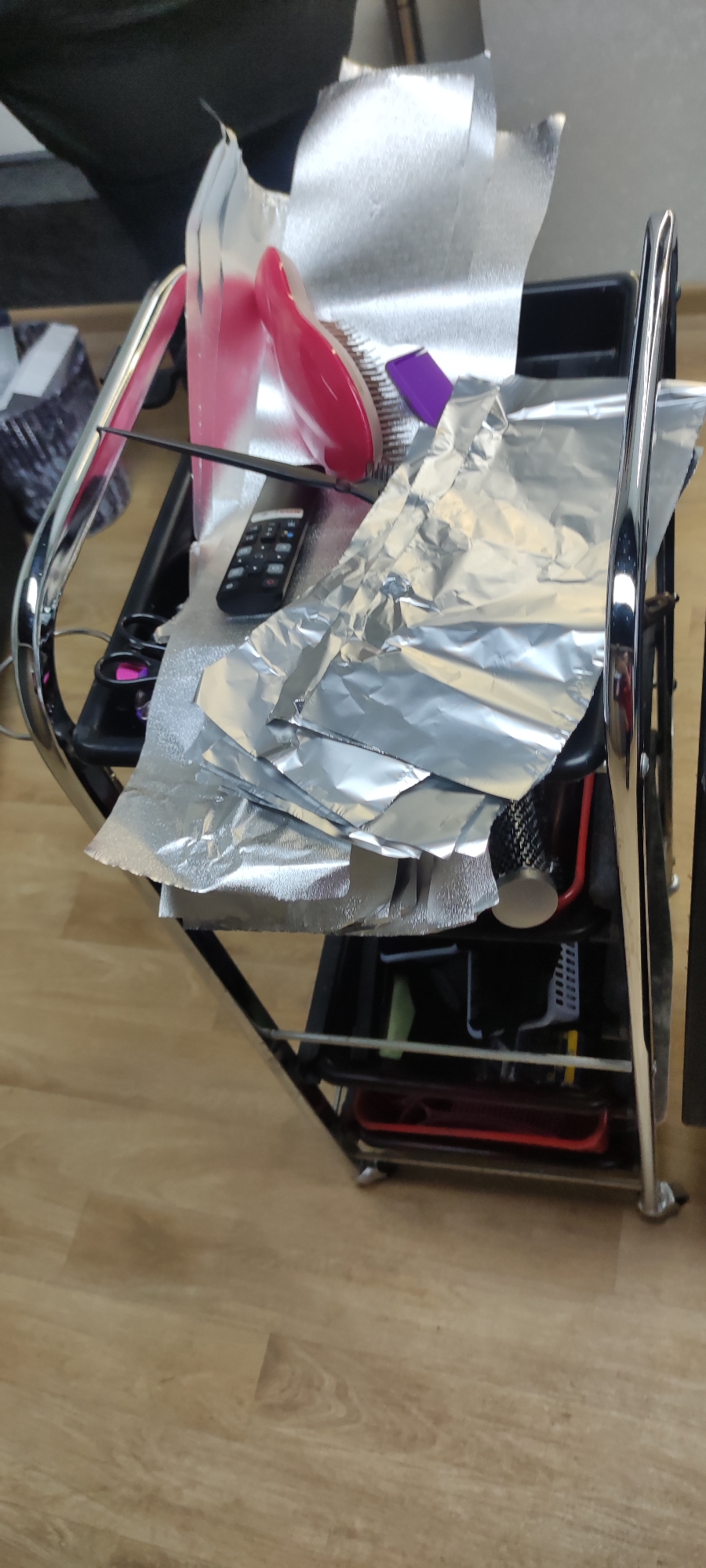 A three-tiered metal salon cart, likely located in a hair salon in Chaikovsky, Russia, is positioned on a light-colored wooden floor. The top tier of the cart contains hair styling tools, including pink brushes, a purple tinting brush, a remote control, scissors, and stacked sheets of aluminum foil. The middle and bottom tiers hold a variety of unidentified hair styling equipment.