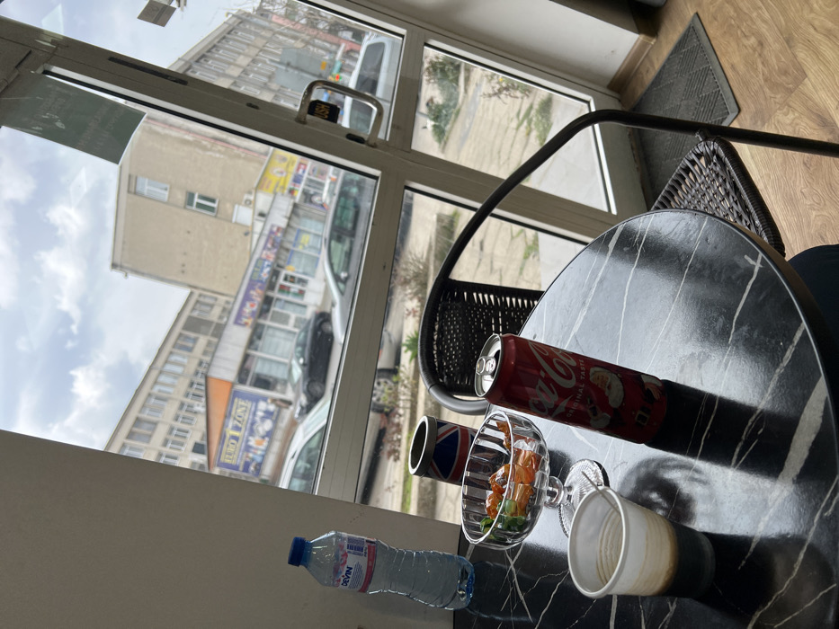 The image displays an interior view looking outwards through a large window onto a street in Kazanlak, Bulgaria, specifically near the "EURO ZONE" store located on ul. "Gen. Skobelev" 26. In the immediate foreground, a round black table with white marble-like veining holds several items. On the table, from left to right, are: a clear plastic bottle of "DEVIN" mineral water, partially full; a disposable white and brown cup containing a small amount of dark liquid residue; a clear glass pedestal dish filled with various colorful hard candies; a cylindrical holder or cooler adorned with a Union Jack flag design; and an open red Coca-Cola can featuring a Santa Claus graphic. A dark, woven chair is partially visible to the right of the table, and the floor appears to be light brown wood. The window, framed in white, offers a view of an urban environment under an overcast sky. A "PUSH" sign is visible on the handle of a glass door to the right. Across the street, a multi-story building houses several ground-floor establishments, prominently featuring a shop with an orange facade and a blue sign reading "EURO ZONE." Other storefronts with assorted signage are adjacent. Multiple vehicles, including a black sedan and several grey cars, are visible on the street. In the background, another large, beige building with numerous windows stands beyond the commercial street level. Minimal ground vegetation is present along the sidewalk. No individuals are visible in the scene.
