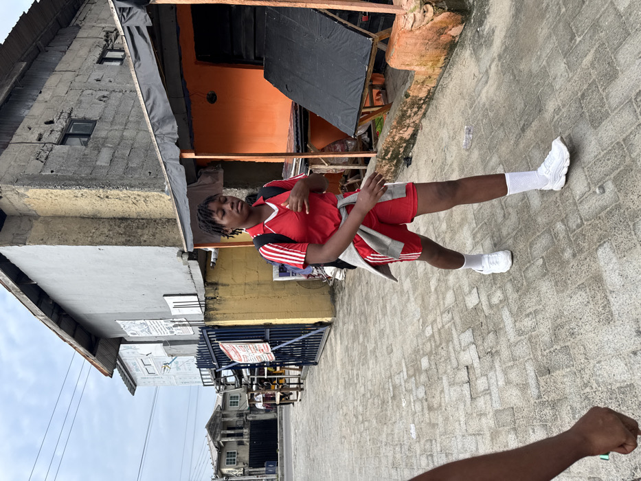 An individual is depicted walking on a paved street in Badore, Nigeria, under an overcast sky. The subject, who appears to be female, has dark, short dreadlocks and wears a red athletic shirt with white shoulder stripes, matching red shorts with white side stripes, white socks, and white sneakers. A grey hooded sweatshirt is tied around their waist, and a dark backpack is worn. Their eyes are closed or downcast, and their left hand is positioned near their chest. To the subject's right is an orange-painted commercial structure with a black corrugated overhang. Beneath the overhang, a dark, rectangular object on a wooden stand is present. In the mid-ground to the left, a multi-story concrete block building with light grey painted and unpainted sections stands behind a yellow wall and an open blue metal gate. Multiple signs are affixed to this building. Further down the street on the left, a white residential-style building with columns is visible. Overhead electrical wires are evident against the sky. The street surface is composed of grey interlocking pavers, and a discarded plastic bottle is on the ground. A partial arm and hand, belonging to another individual, are visible in the lower-left foreground.