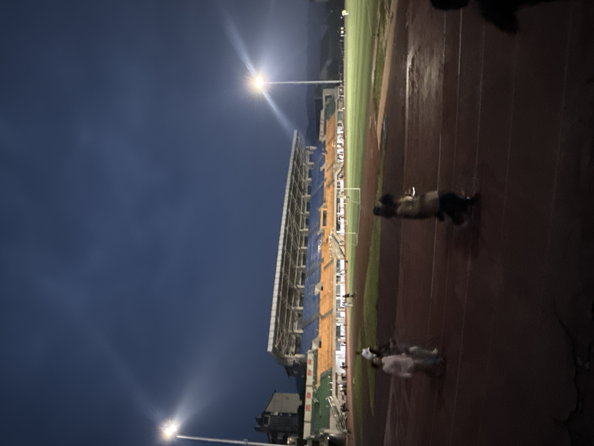 n outdoor stadium, likely located in Jiangjin, China, based on visual cues. The stadium seating is predominantly blue and orange. There is a running track surrounding a green sports field, possibly for soccer or other field sports. The lighting suggests it is evening or night, with stadium lights illuminating the scene. Several people are present on the track. The environment appears urban with buildings visible near the stadium.