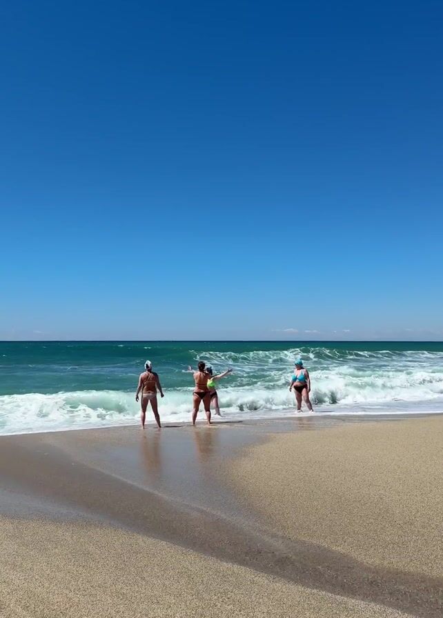 three women standing on a beach on a sunny day. All three are wearing swimsuits and facing the ocean. The woman in the center is standing with her arms outstretched. The sea has small waves. The beach is sandy. The sky is blue.