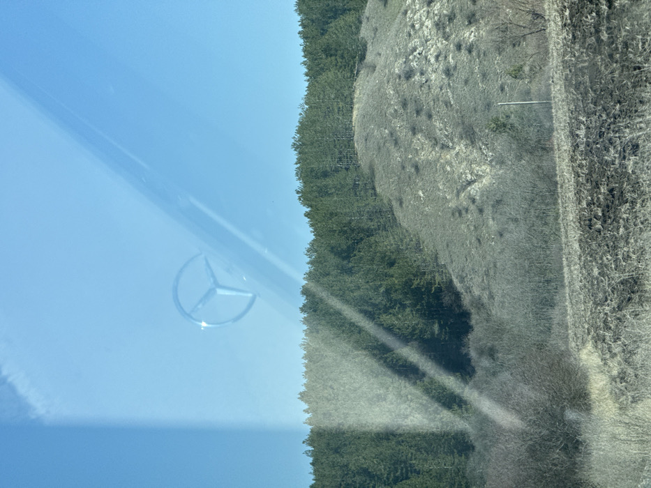 This image depicts an outdoor rural landscape observed from within a vehicle in Galabovtsi, Bulgaria. The scene is dominated by a clear, light blue sky in the upper portion. A reflection of a chrome Mercedes-Benz hood ornament, specifically the three-pointed star within a circle, is prominently visible in the upper left quadrant of the vehicle's windshield. Faint, diagonal light reflections are also apparent on the glass, particularly towards the lower left. The natural environment features a distant treeline composed of dense, dark green coniferous trees, likely pines, forming a distinct horizontal band across the mid-horizon. Below this treeline, a rolling, sparsely vegetated hill or mound with patches of dry, light-colored earth and grass is visible. In the midground, a strip of leafless deciduous trees and shrubs stretches across the scene, indicating a late winter or early spring season. A single, slender utility pole stands vertically on the right side, partially obscured by the foreground vegetation. The immediate foreground consists of a dark, tilled agricultural field on the right, and areas of dry, yellowish-brown grass and bare shrubs on the left. No individuals or animals are present in the visible landscape.