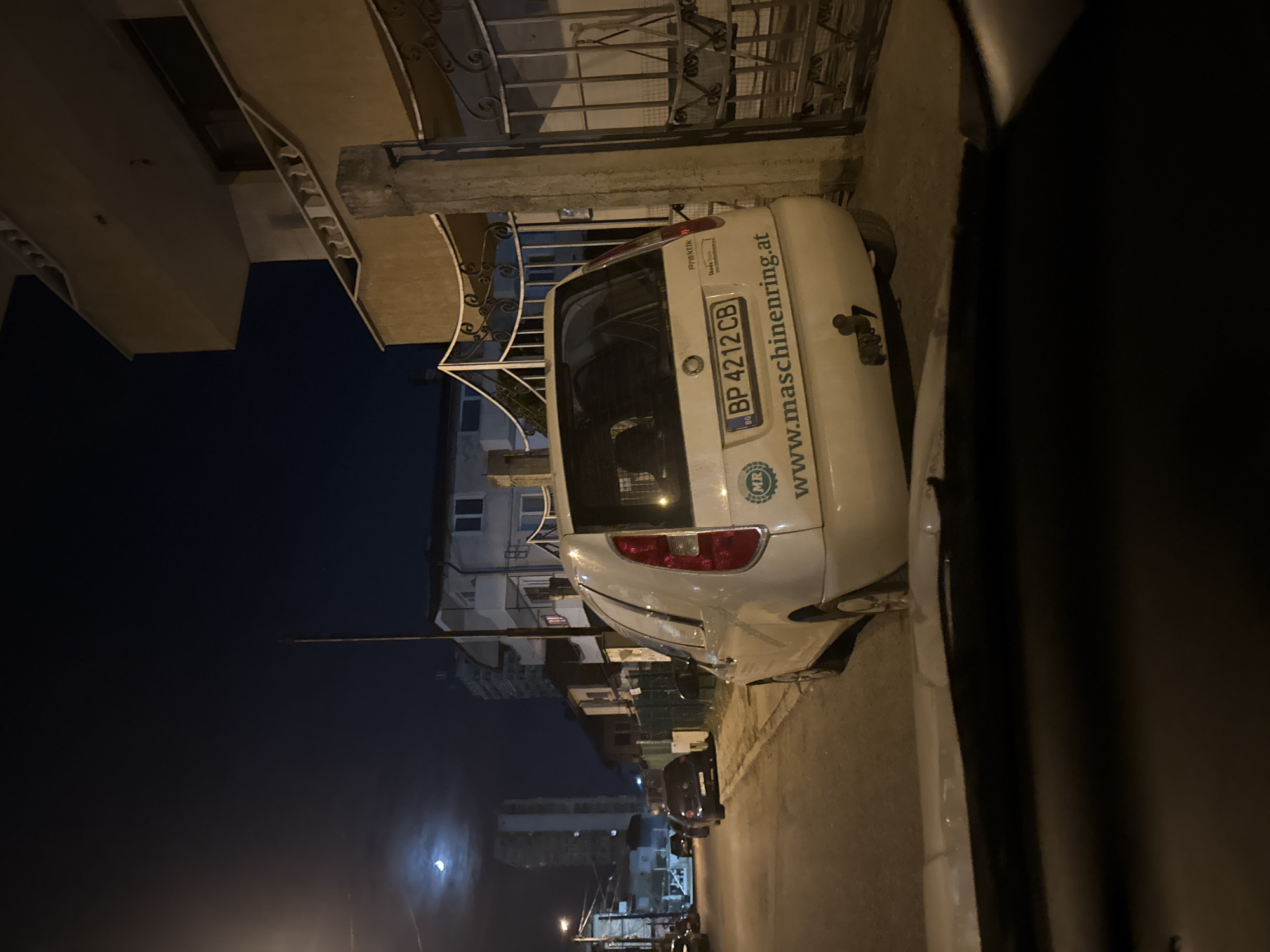 The image captures a nighttime street scene in Vratsa, Bulgaria. The perspective is from inside a vehicle, with its dashboard visible at the bottom of the frame. A white Skoda Roomster, displaying Bulgarian license plate "BP 4212 CB" and prominent "Maschinenring" branding with the website "www.maschinenring.at" on its rear, is parked parallel to the curb on the right side of the street. The vehicle also features a tow hitch and "ŠKODA Roomster Praktik" badging. Adjacent to the parked Skoda, on the right, is a multi-story residential building with light-colored walls, balconies with balustrades, and a dark, ornate metal gate. Further down the street on the left, several other dark-colored cars are parked. In the background, various residential buildings are visible under the dark sky, including a tall building with scaffolding. A bright crescent moon is visible in the upper-left quadrant of the sky. Artificial light sources, including a streetlight on the left, illuminate the scene.