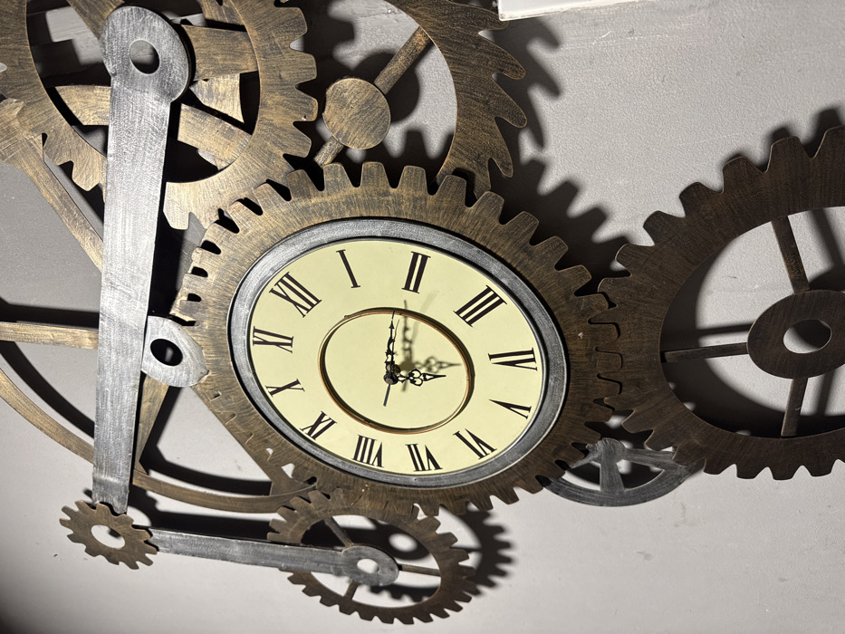 A large, decorative wall clock with an industrial/steampunk aesthetic is depicted, mounted on a light grey wall