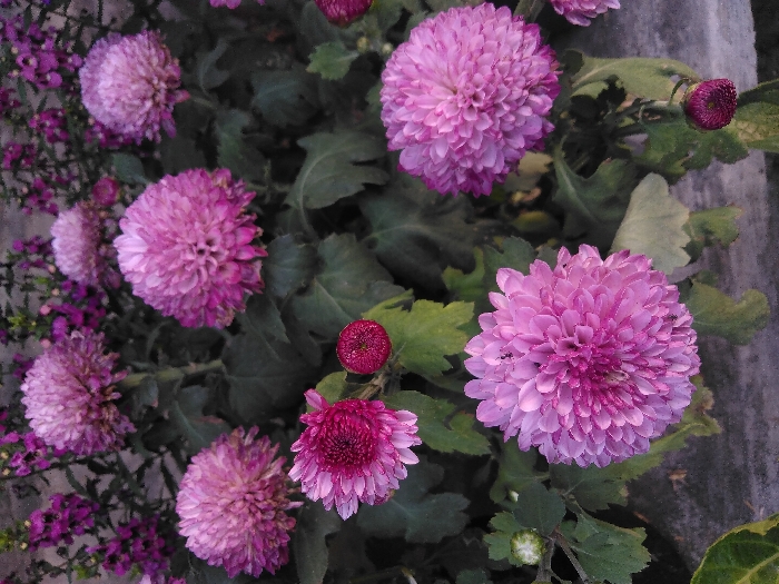 This image captures a close-up, overhead perspective of a dense arrangement of flowering plants in Los Teques, Venezuela. The primary subjects are numerous chrysanthemums (likely pompon or decorative types) in various stages of bloom, predominantly displaying shades of light to medium purple and pink. Approximately eight large, fully open chrysanthemums with a spherical, densely petaled structure are prominent. Their colors range from a soft lavender-pink to a more vibrant magenta-pink. One partially open flower in the lower-middle-left exhibits a deeper magenta center, contrasting with its lighter outer petals. Two small, tightly closed buds of a similar deep magenta hue are visible, one in the lower-middle and another in the lower-right. The flowers are supported by dark green stems and foliage, which are partially visible between the blooms and in the background. In the upper background, out-of-focus clusters of smaller, darker purple flowers are present, suggesting additional plant varieties. A small, dark insect is discernible on the upper surface of the large chrysanthemum located in the lower-left quadrant. The bottom edge and lower-right of the frame show a light grey, textured surface, possibly a planter's rim or ground. The lighting suggests an outdoor environment.