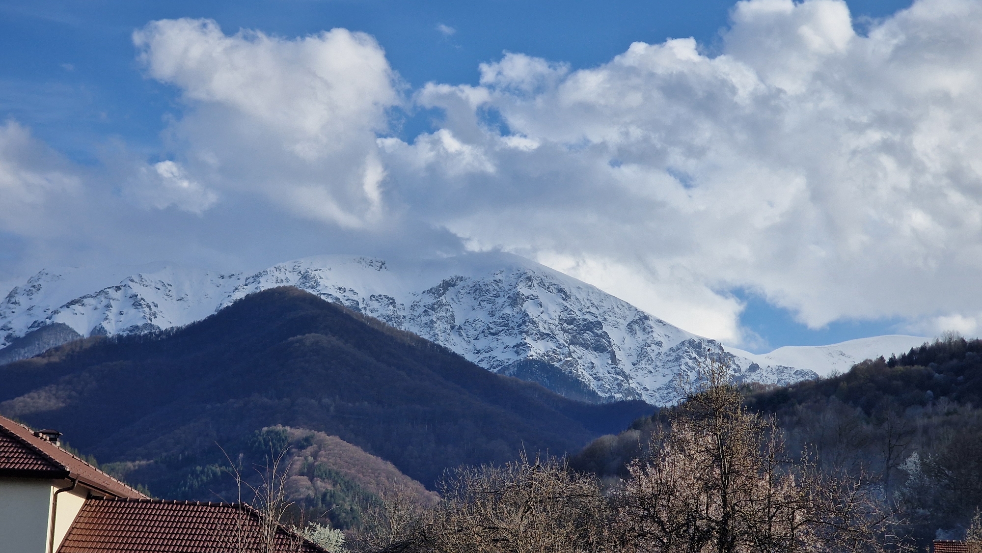 The image presents a landscape view in Apriltsi, Bulgaria, showcasing a range of mountains, some with snow-covered peaks, under a sky dotted with white clouds and patches of blue. In the foreground, the roof of a building with red-brown tiles is visible, along with leafless trees. The middle ground features forested hills in darker shades, contrasting with the snow-capped mountains behind. The overall scene suggests a transition season between winter and spring.