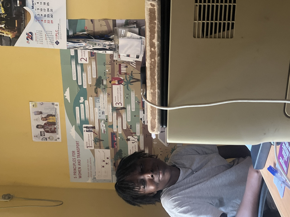An adult female is seated at a wooden desk in an indoor office setting in Ijanikin, Nigeria