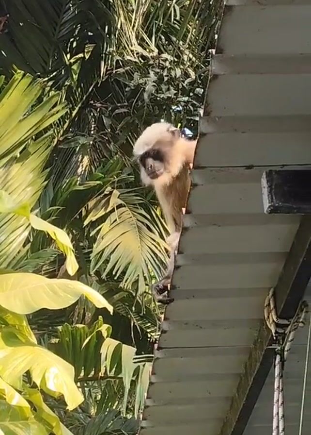 monkey clinging to the edge of a gray roof. The monkey has light-colored fur on its head and darker fur on its body. It appears to be looking down. Lush green vegetation surrounds the roof. The scene is well-lit with natural sunlight.