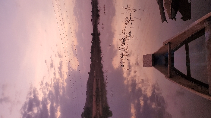 A sideways view of a placid body of water reflecting a dusky, cloudy sky. A narrow strip of vegetation lines the opposite shore. In the foreground, a weathered wooden structure, possibly part of a boat or dock, juts into the scene. Overhead, a grid of power lines stretches across the sky, adding a touch of industrial presence to the serene landscape.