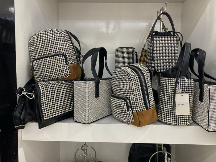 - "The image depicts a retail display of approximately ten rhinestone-embellished bags on white shelves within a commercial establishment in Istanbul, Turkey" by FM-QKjH13, licensed under CC BY 4.0