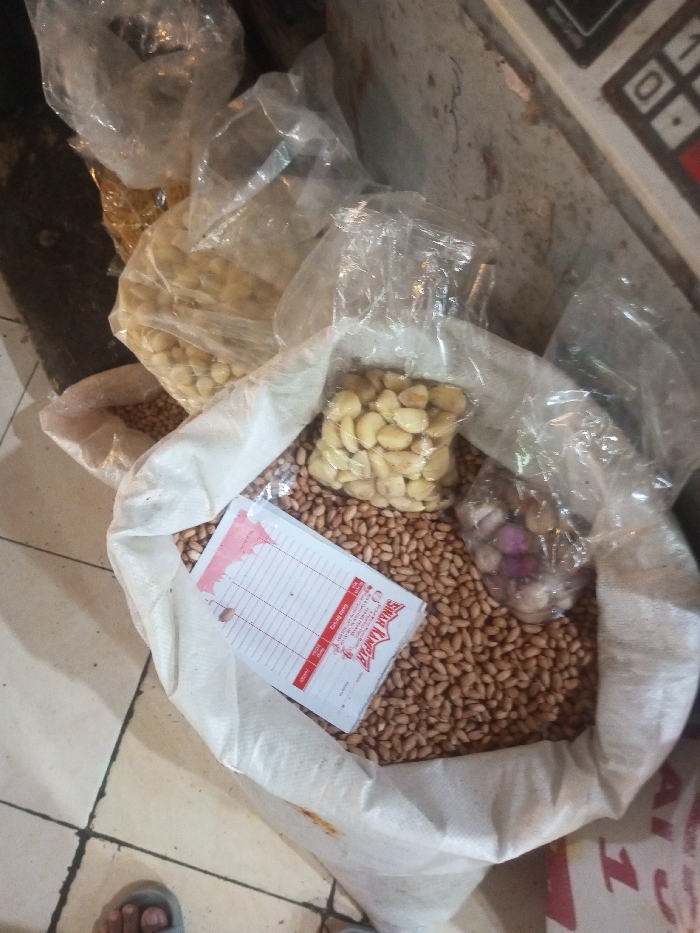A top-down shot reveals a white sack filled with peanuts. Scattered atop the peanuts are plastic bags containing garlic cloves and shallots. A receipt with red trim sits on the peanuts within the sack. Additional bags of garlic and what appears to be nuts are visible around the sack. A corner of a weighing scale is visible in the upper right, with tiled flooring in the lower left.