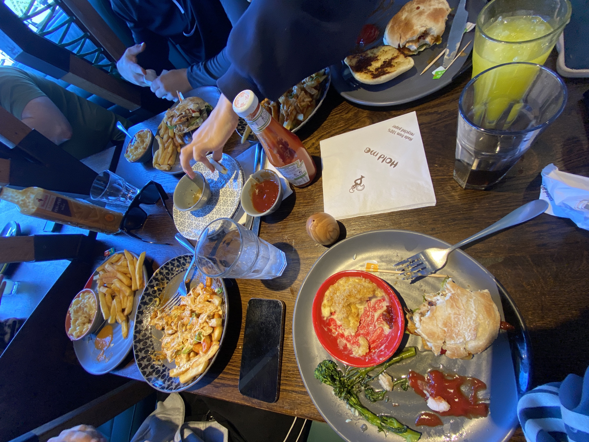 The image captures a table setting, presumably in a restaurant or pub, featuring several diners enjoying a meal. The location is possibly in Elmbridge, United Kingdom. The table is wooden, with various plates of food, glasses of beverages, and other dining accessories scattered across it. The meals consist of fries, burgers, and what appears to be a pasta or noodle dish. Plates contain both untouched food and remnants of what has been consumed. Condiments, including a bottle of sauce and small bowls of ketchup, are also present. Diners' hands and partial bodies are visible around the table, suggesting an ongoing dining experience. Some diners appear to be interacting with their food, while others are engaged in conversation or other activities not fully captured in the image. A napkin and a mobile phone are also on the table.