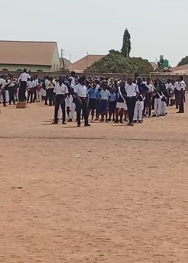 marching band practicing on a large dirt field