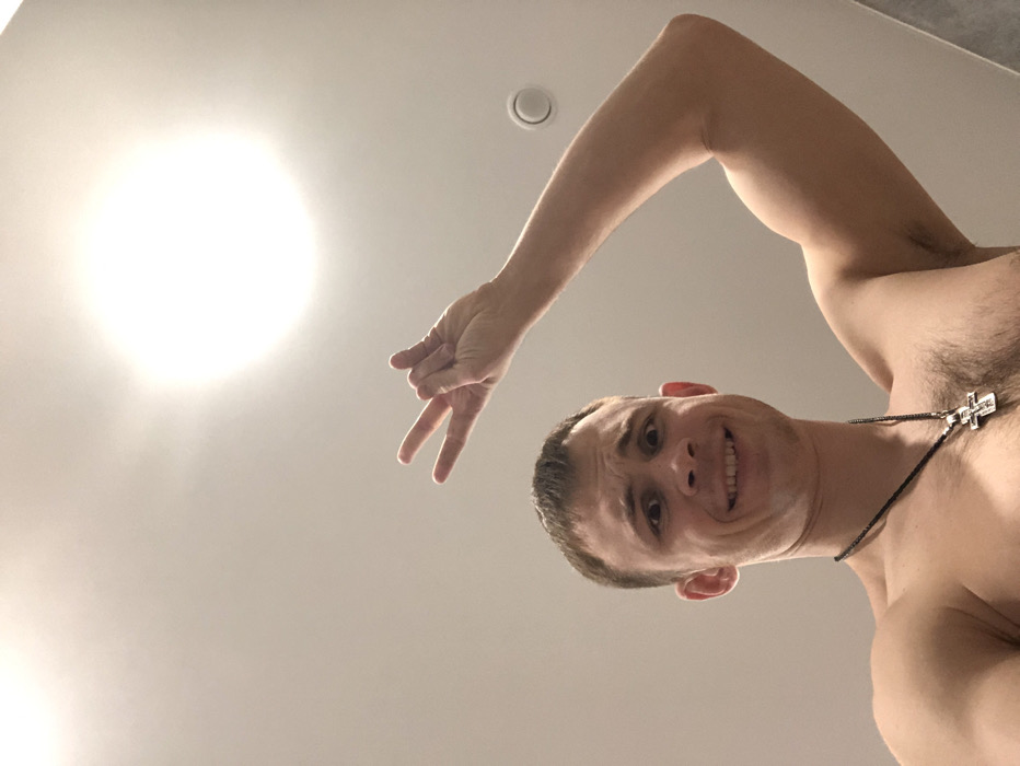 A low-angle indoor photograph shows an adult male from the chest up, centered in the frame against a plain, light-colored background, likely a ceiling or wall. The male has short, light brown hair and is shirtless, wearing a dark cord necklace with a metallic cross pendant. He looks directly at the camera with wide eyes and an open-mouthed grin, revealing his teeth. His right arm is raised and bent at the elbow, with his hand positioned above his head, forming a gesture where the index and pinky fingers are extended while the middle and ring fingers are folded. A bright, circular overhead light fixture is prominently visible in the upper center of the frame, and a smaller, light-colored circular fixture or vent is partially visible on the far right side of the background. The scene takes place within an interior room in the city of Unknown, Unknown.