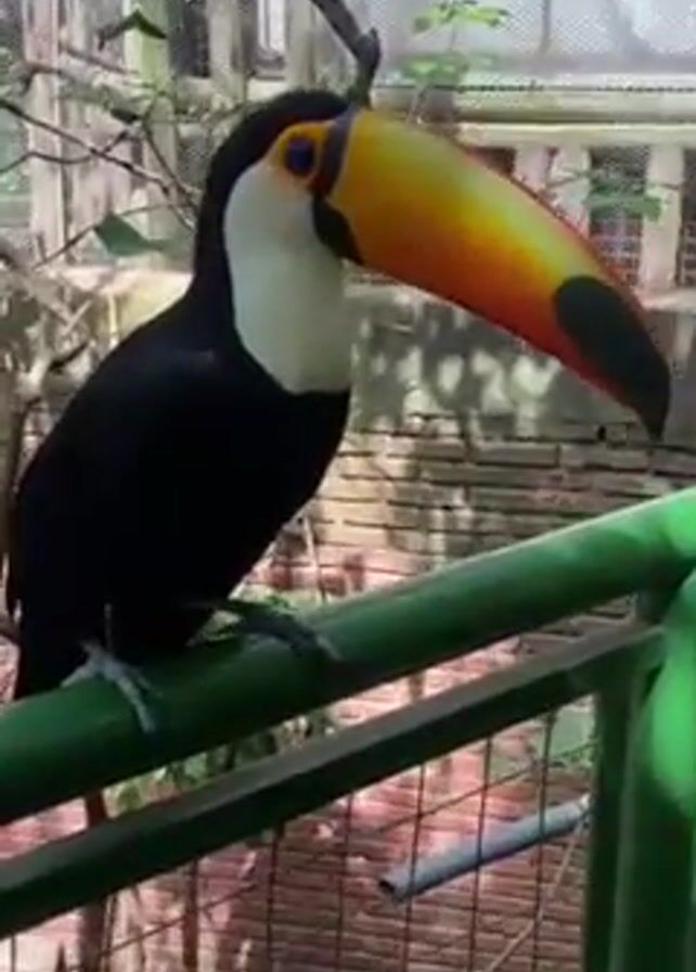 - "toucan perched on a green metal bar inside an enclosure" by FM-33abC2, licensed under CC BY 4.0