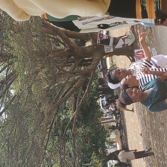 This image depicts an outdoor scene in Ihiagwa, Nigeria, characterized by an unpaved, light-brown ground area and several trees providing natural shade