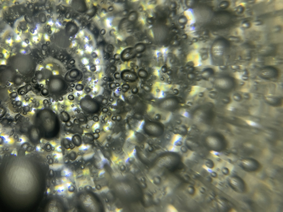 This image depicts a highly magnified, abstract view of numerous spherical and ovoid gas bubbles suspended within a clear, transparent medium