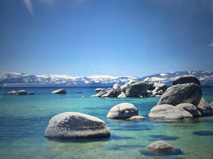 The image depicts a serene natural landscape featuring a clear blue lake with multiple large, rounded boulders partially submerged in its turquoise waters