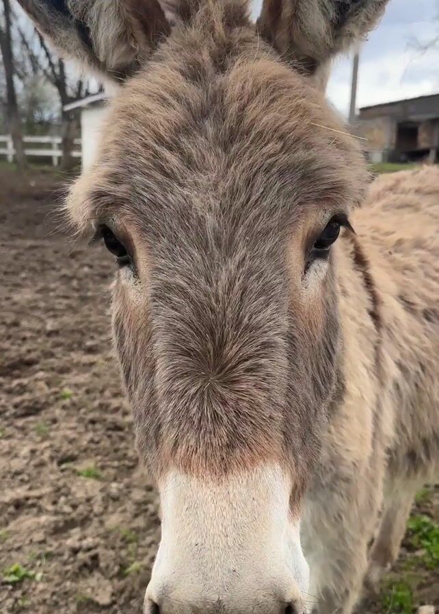 The camera focuses closely on a donkey standing in a muddy pen