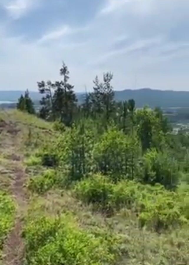 The video captures a scenic view from a hilltop. The camera pans across the landscape, revealing a dirt path leading along the crest of the hill, surrounded by lush greenery and scattered pine trees. In the distance, a town sits nestled amidst the forest, with rolling hills visible in the background. The sky is blue with scattered clouds. The video conveys a sense of tranquility and natural beauty.