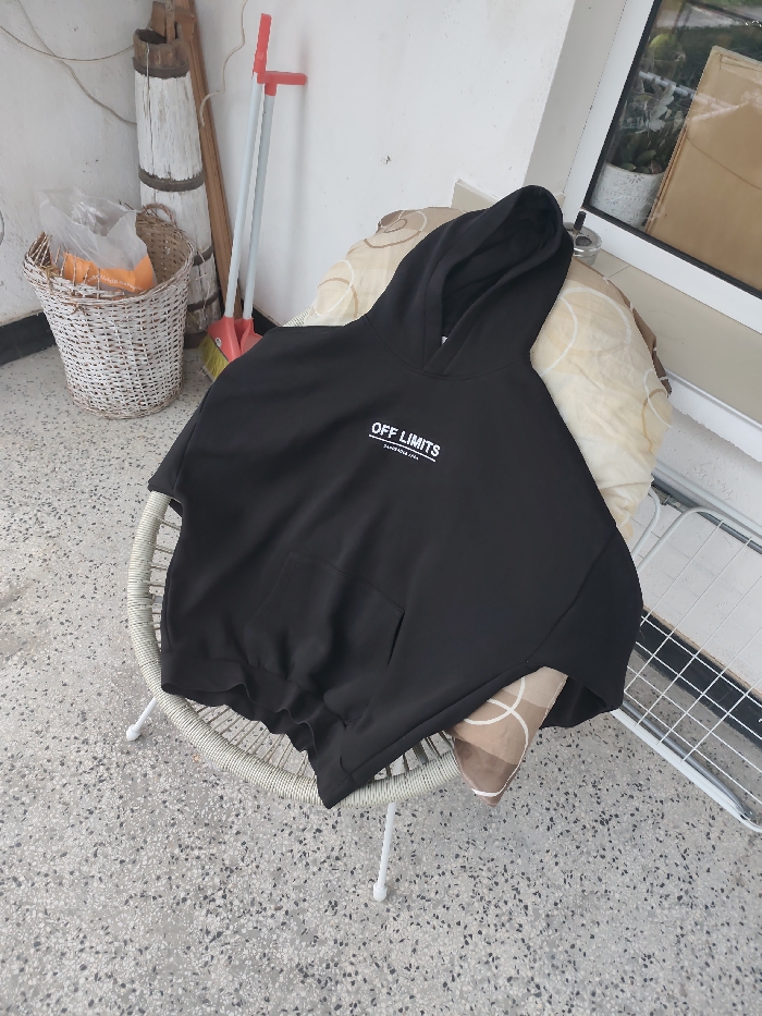 - "This image depicts a black hooded sweatshirt, emblazoned with the white text "OFF LIMITS" and "SANCAKDENIM" below it, draped over a beige and brown geometric-patterned pillow" by FM-jJr6Q2, licensed under CC BY 4.0