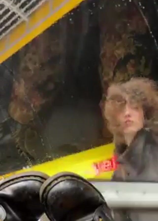 A person with curly brown hair, wearing a black jacket, is seen through a glass window of a yellow vehicle. They are cleaning the glass with a red and white squeegee. In the foreground, two black Doc Martens boots with yellow laces are visible, suggesting the view is from inside the vehicle looking out. The background inside the vehicle is dimly lit. The overall setting seems to be a casual, possibly urban environment.