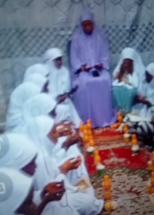 Several people wearing white hijabs are gathered on a carpet, some holding objects in their hands. One person is wearing a light purple robe and sits behind them. There are orange bottles on the carpet. The background features a patterned fabric. Some individuals appear to be praying or engaged in a religious ceremony.