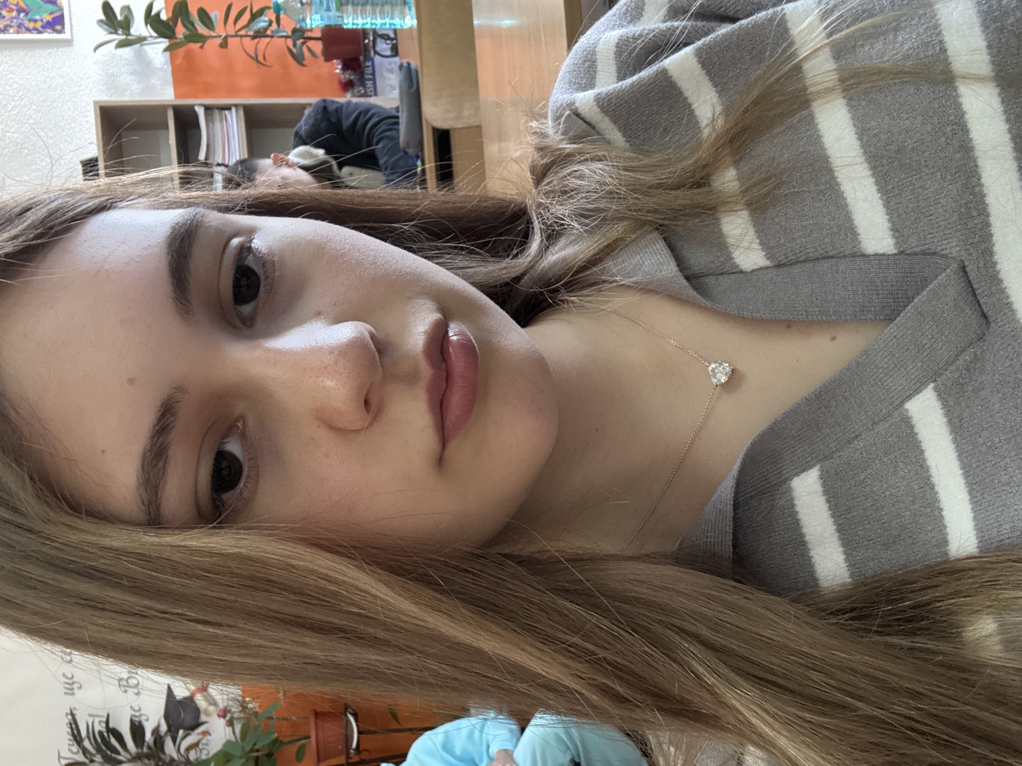 A selfie of a young woman with long blonde hair is featured. She is wearing a gray and white striped sweater and a delicate necklace with a heart-shaped pendant. The background is cluttered, with a bookcase and various objects visible, including a person in the distance. The location and city of Panagyurishte, Bulgaria, cannot be determined from the image.