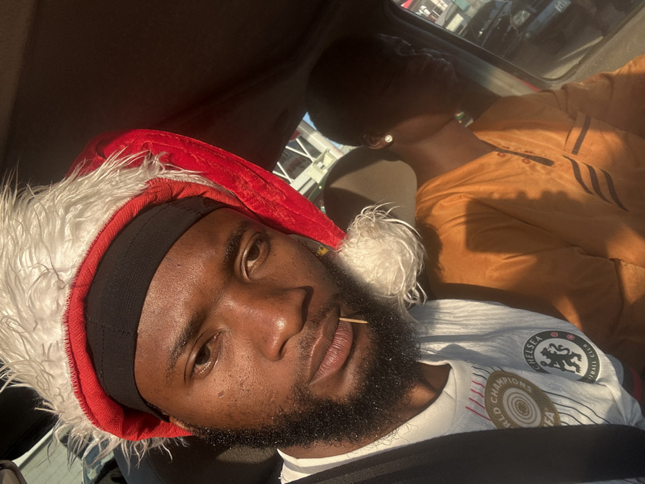 A selfie-style image depicts two individuals inside a vehicle, illuminated by strong sunlight from the right. In the foreground, a dark-skinned male with a beard and mustache looks directly at the camera. He wears a red and white Santa hat over a black headband, and a wooden toothpick is visible in the right corner of his mouth. His white t-shirt features a 'WORLD CHAMPIONS FIFA' badge and a 'CHELSEA FOOTBALL CLUB' crest. A black strap crosses his chest. Behind him and to his right, a second dark-skinned individual is partially visible, largely obscured by shadow. This individual has short hair and wears a light-colored earring in their visible ear, along with an orange or brown long-sleeved garment with dark horizontal stripes. No specific geographic markers are visible within the image to confirm the location as Jos, Nigeria.