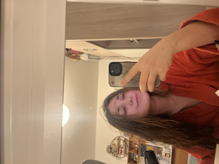An interior mirror selfie depicts a young female with long, damp, brown hair, wearing a textured red bathrobe