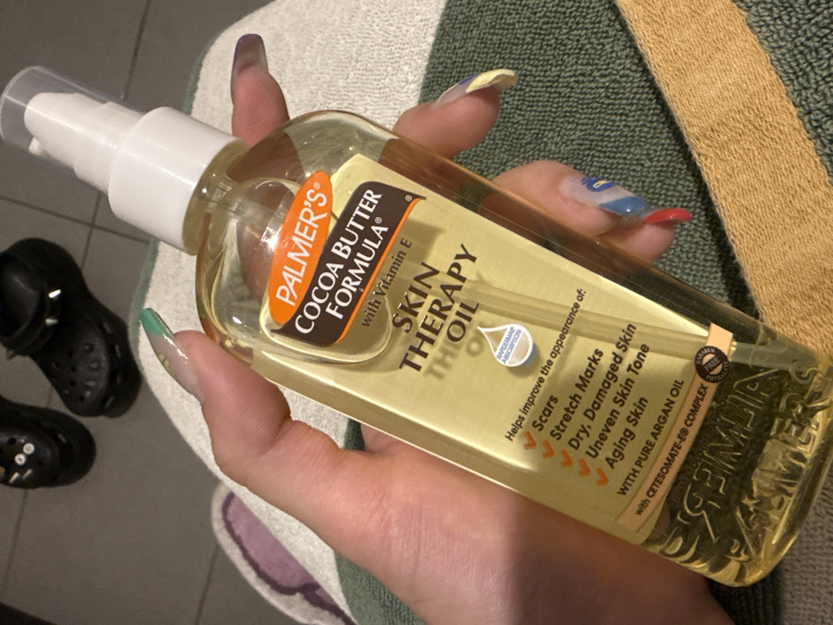 A hand holds a bottle of Palmer's Cocoa Butter Formula Skin Therapy Oil. The transparent bottle reveals a clear, light yellow oil. The label promotes ingredients like Vitamin E and Pure Argan Oil. It highlights benefits such as improving the appearance of scars, stretch marks, dry skin, uneven skin tone, and aging skin, boasting rapid absorption. Crocs shoes are visible on the floor next to a towel. The hand has long nails that have different designs on them.