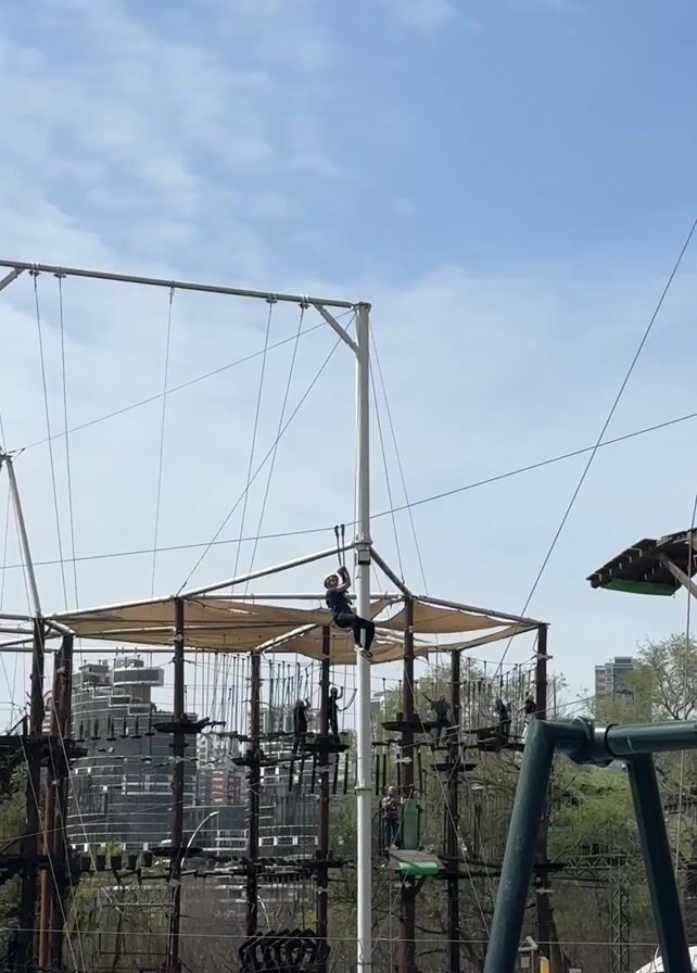 child in a harness riding a zip line at an outdoor adventure park. The child, wearing a helmet and harness, is seen zipping from one platform to another. The adventure park has multiple levels of platforms connected by various rope bridges and zip lines. Other people are seen on the different platforms. Below, a child is sitting on a red, smiling octopus-shaped playground toy, watching the zip liner. The park is in an urban environment, with buildings visible in the background under a partly cloudy sky.
