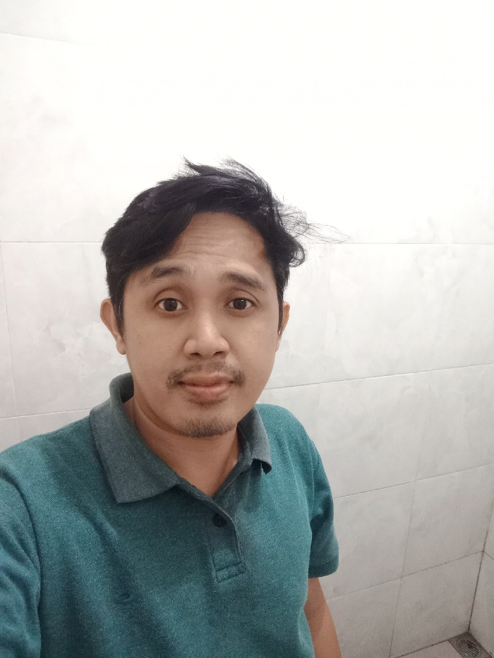 A man with black hair and brown eyes faces the camera. His hair is slightly messy and partially covers his forehead. He has a mustache and a light beard. He wears a teal polo shirt. The background is a white tiled wall. The lighting appears to be soft and even.