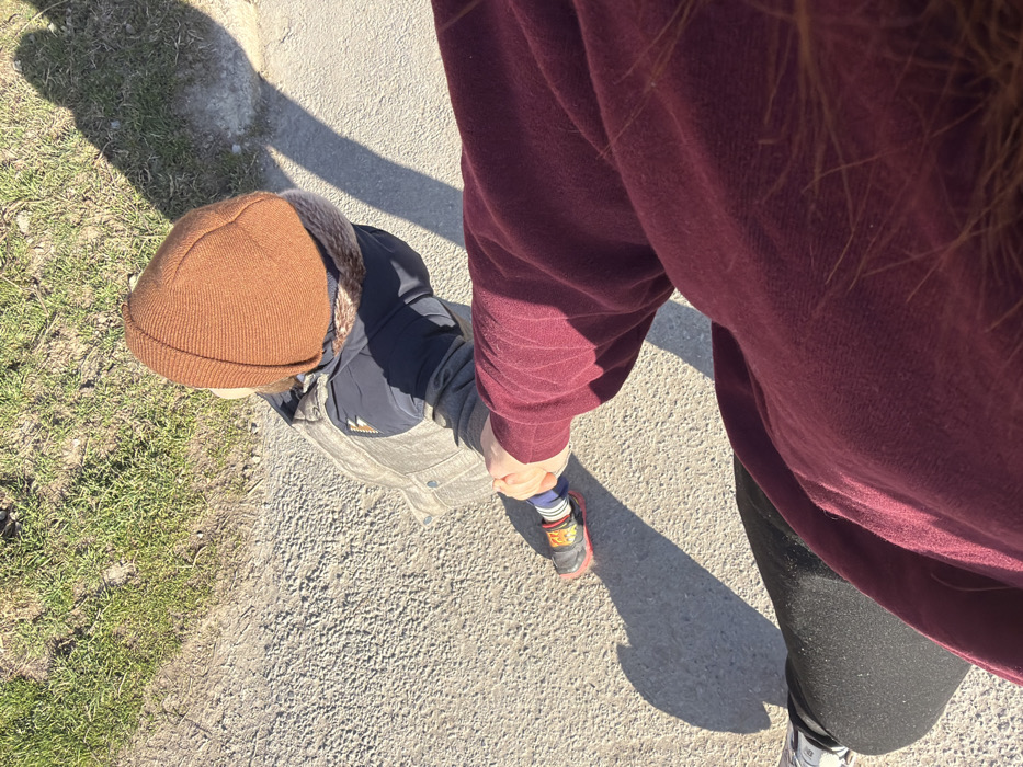 An overhead, slightly forward-angled view depicts two individuals walking outdoors on a sunny day in Sofia, Bulgaria. In the foreground, the upper torso and arm of an adult are visible, clad in a maroon/burgundy long-sleeved top and black pants, with a portion of light brown hair at the bottom right. This individual's right hand grasps the left hand of a smaller person, likely a child, positioned slightly ahead. The child wears a ribbed, reddish-brown beanie with a fur lining, a dark blue garment, and a grey or tan padded jacket/vest. Their left foot is visible, wearing a blue and white striped sock and a black and red sneaker with a distinctive orange/yellow pattern on the side. Both individuals cast long, distinct shadows on the light gray, textured ground, which appears to be a gravel path or pedestrian walkway. To the left of the path, an area of sparse green grass with visible dirt is present.