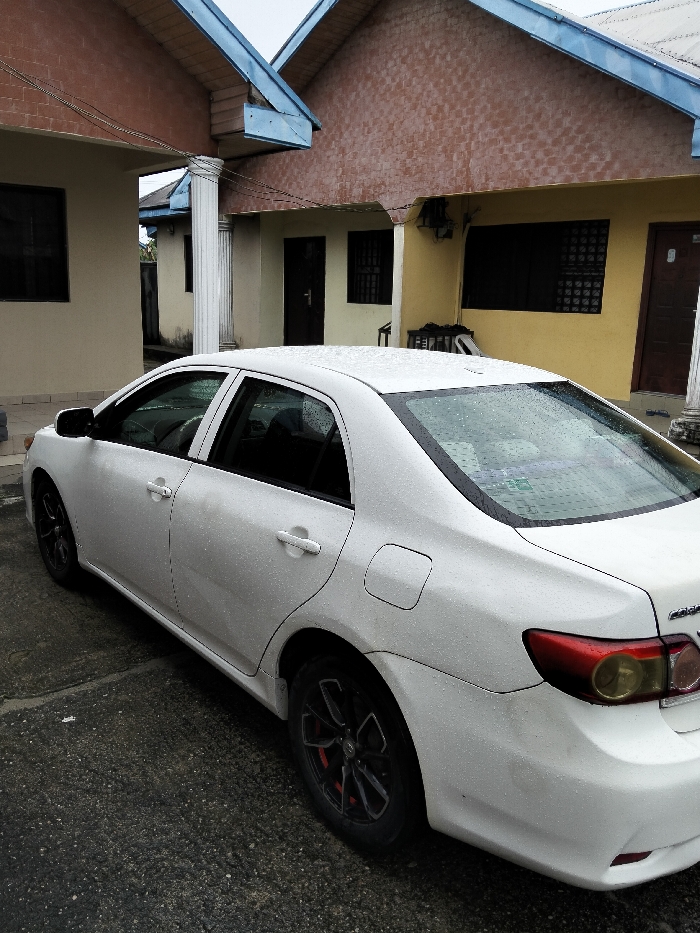 A white Toyota Corolla is parked on a paved surface. Raindrops cover the car's exterior. The vehicle is positioned in front of several buildings with light-colored walls and dark trim around windows and doors. One building features a unique patterned wall texture. The sky is overcast.