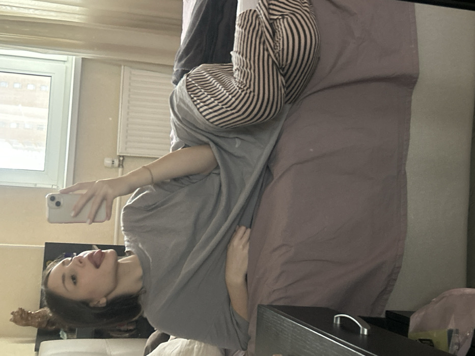 A female individual is depicted lying on her left side on a bed within a residential room, identified as being in Kudrovo, Russia. She wears an oversized grey t-shirt and striped pajamas, holding a light-colored smartphone in her right hand to capture a selfie. Her tongue is extended from her mouth as she looks towards the phone. The bed is covered with a dark purple sheet. To the left, a dark nightstand with a silver handle is partially visible, along with a white headboard and a shelf holding a brown animal figurine. To the right, a window with a white frame shows a view of exterior light-colored residential buildings. Below the window, a white radiator is mounted on a light-colored wall. The room is illuminated by natural light entering through the window.