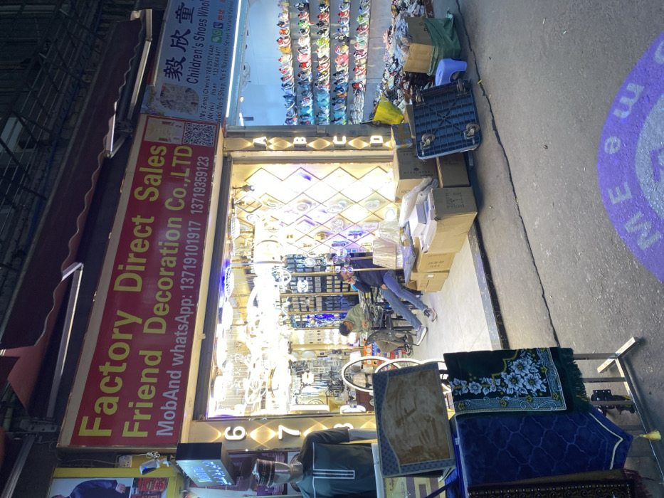The image depicts a nighttime street scene in Yuexiu District, Guangzhou, China, specifically referencing Nayuexi Street and Xingfa Street. The foreground shows a purple circular mat with partially visible white text on an asphalt surface. Two adjacent storefronts dominate the midground. The left storefront, labeled "Factory Direct Sales Friend Decoration Co., LTD" on a red and yellow sign, is a brightly lit interior showcasing a large array of chandeliers and light fixtures. Inside, two adult males are visible; one in a light-colored top is seated at a desk, while another in a dark jacket and jeans sits on a low object, holding a phone to his ear. Outside this shop, to the left, a mannequin wears a dark tunic and skullcap, next to a display stand holding two folded rugs, one dark blue and one green with white floral patterns. Stacks of cardboard boxes and several lampshades are arranged near the entrance. The shop entrance features vertical illuminated numbers "67" on the left frame. To the right, a second storefront, identified as "Children's Shoes Wholesale" (with corresponding Chinese characters and contact details, including an address within Yuexiu District), displays numerous colorful children's shoes neatly arranged on shelves in its brightly lit interior. Piles of clothing or textiles are scattered near this entrance, alongside a blue plastic stool and a tipped blue plastic trolley with wheels. Vertical letters "A B C D" are visible on the door frame separating the two shops. Both shops have awnings above their signs, red for the left and partially visible blue for the right.