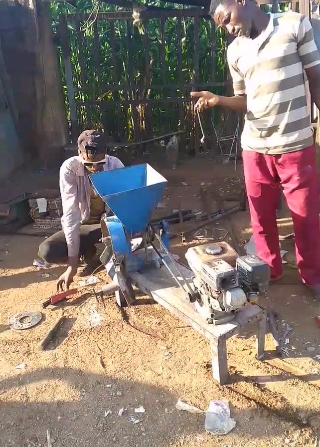 Two men are outside in a dirt area next to a fence. One man is standing and wearing a striped shirt and red pants. The other man is sitting and wearing a tan shirt and a face covering. The sitting man is working on a piece of machinery that is blue. The standing man appears to be supervising or directing. There is corn or other green plants visible behind the fence. There are tools scattered around the area.
