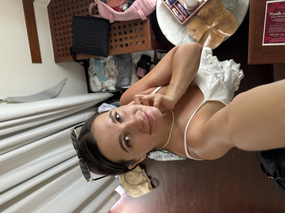 A woman poses for a selfie, her face centered. She is fair-skinned with dark hair and wearing a white top with thin straps. Sunglasses are perched on her hair near her ear. The background features wooden lattice shelves, a white-draped bed, and a round table with decorative objects. A pink bag and various items are on the shelf behind her. A poster or sign is partially visible on a dark wooden surface to the right. The overall impression is casual and domestic.