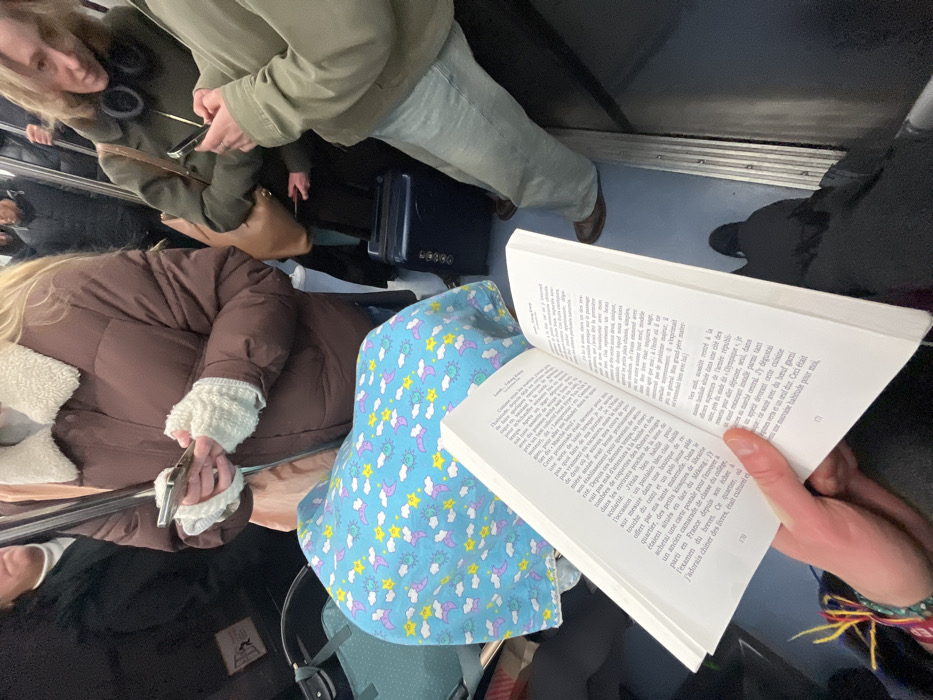 The image captures a scene on public transportation, likely a train or subway. Multiple people are present, including one wearing a brown puffer jacket, another in a green jacket, and someone holding a book open to pages 170 and 171. The text on the pages appears to be in French, discussing events related to school, politics, and personal experiences. There's luggage or bags near the feet of the passengers, indicating they may be traveling. Overall, it presents a snapshot of daily life in an urban environment.
