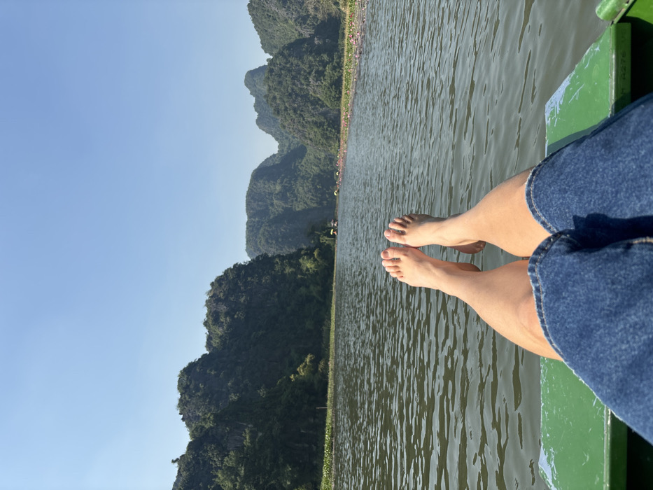 From a low vantage point, a person in denim shorts sits with bare feet dangling over the edge of a green-painted boat