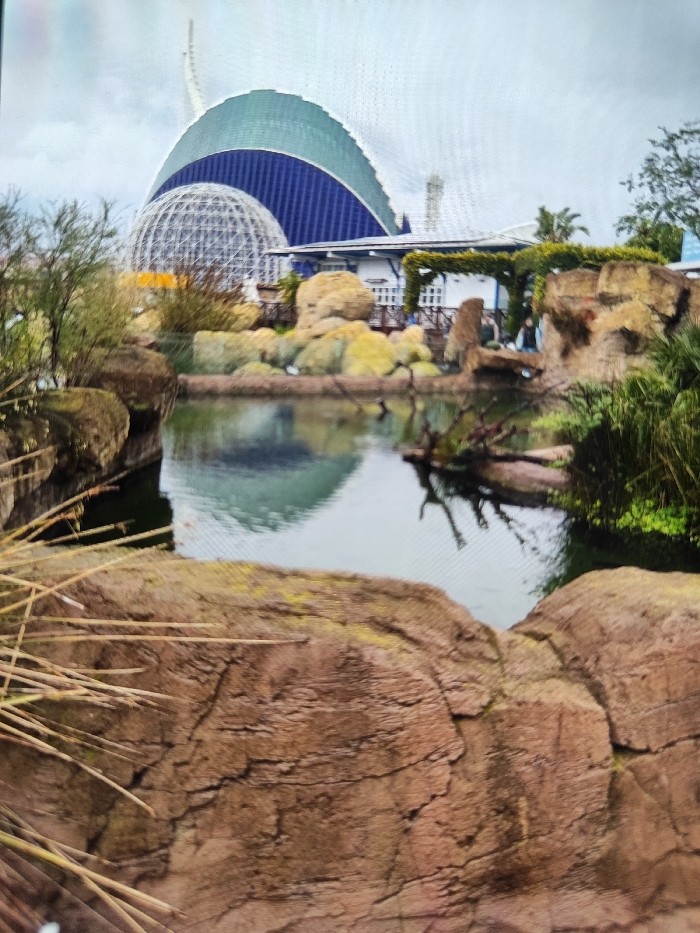 The image displays an outdoor landscaped environment, situated in the city of Kulata, Bulgaria. The foreground is dominated by large, rough, reddish-brown rock formations, partially overgrown with sparse, dry, yellow-brown reeds on the left. In the midground, a dark, reflective pond occupies the central space, mirroring portions of the sky and background structures. Surrounding the pond are additional rock formations and various green vegetation, including dense shrubs on the right and sparser foliage on the left. Behind the pond, a white building with blue roof trim is visible, featuring a wooden railing and an arbor covered in green foliage extending to the right. Indistinct human figures are present near this building. The background is characterized by two prominent architectural structures under an overcast sky: a large, curvilinear building with a light blue-green arched roof transitioning into a dark blue facade, topped by a tall white spire-like element on its right side. To its left and slightly in front stands a large, spherical geodesic dome constructed from a light-colored framework. A single palm tree is visible on the far right.