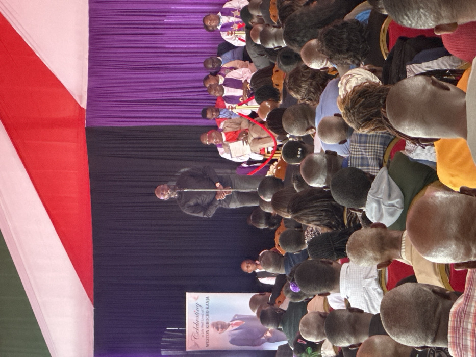 The image depicts an indoor gathering held under a tent-like structure with a ceiling draped in white, red, and green fabric. The event takes place in the city of Unknown, Kenya. A dark-skinned, bald male, dressed in a black long-sleeved shirt and dark trousers, stands center-stage at a microphone, addressing an audience. To his left, a vertical banner displays the text "Celebrating a Life Well Lived of WESTON KIROCHO KANJA" above a portrait photograph of a man in a suit. The stage backdrop consists of black and purple draped curtains. Seated behind the speaker are several individuals. At least three are identified as clergy, wearing purple stoles over white robes. One older male, seated to the speaker's right, wears a light-colored suit with a red tie and a red stole, and holds a document. Red velvet ropes on stanchions are positioned at the front of the stage area. The foreground shows the backs of a large audience, predominantly dark-skinned individuals, seated in red chairs, facing the stage. Their attire varies from casual to semi-formal.