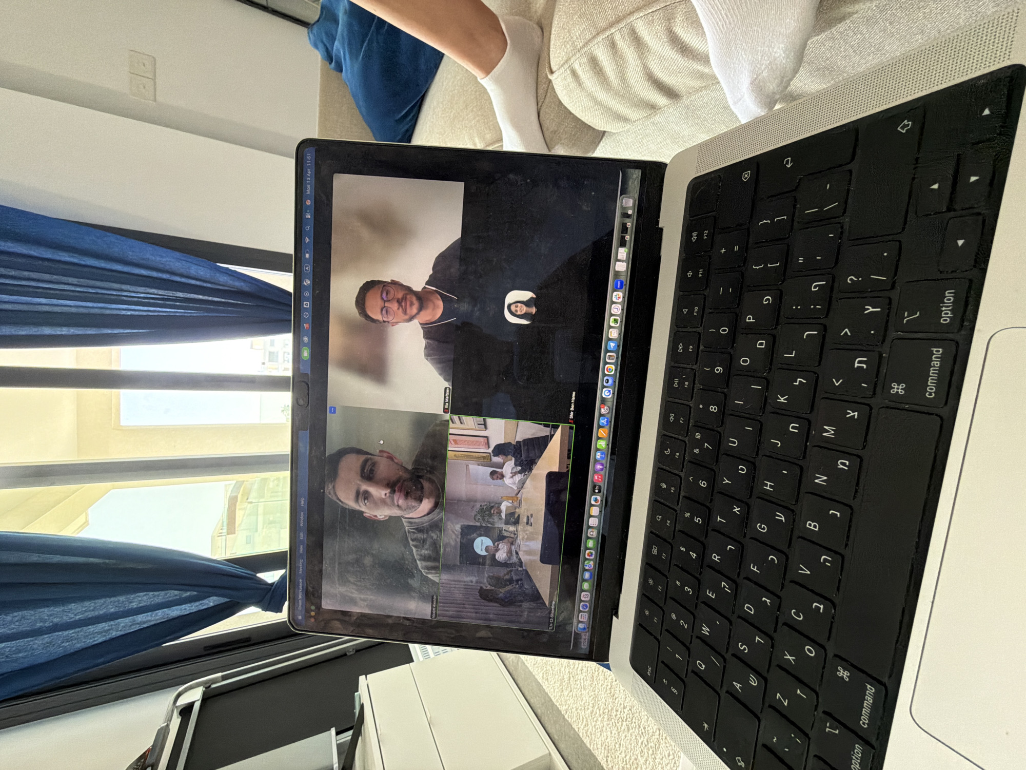 A laptop is open on a couch, displaying a Zoom meeting. Two participants are visible on the screen, one with glasses and the other in an office setting. The keyboard is in Hebrew/English. A blue curtain is visible in the window next to the laptop. There is no indication of Livadia Larnakas, Cyprus.