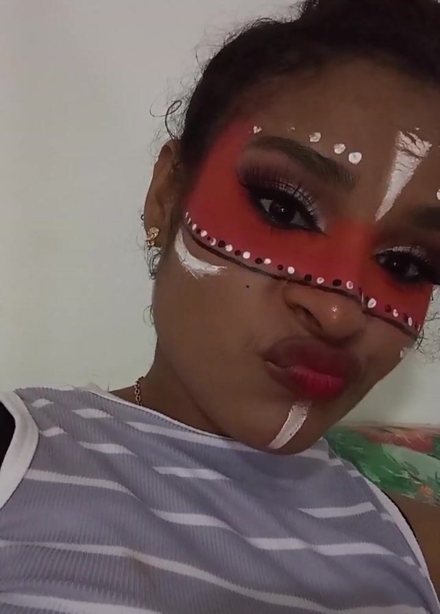 A close-up video shows a young woman with brown skin, dark eyes, and black hair pulled up in a bun. She is wearing a gray and white striped tank top. Her face is decorated with red and white face paint in a tribal or indigenous style. The paint covers her forehead, nose, and cheeks, with dots, stripes, and triangular shapes. She has full makeup on her eyes with long lashes and red lipstick. She purses her lips, smiles, and tilts her head, showing off the face paint. The background is a plain white wall and a hint of a patterned pillow or cushion. The lighting is slightly warm.